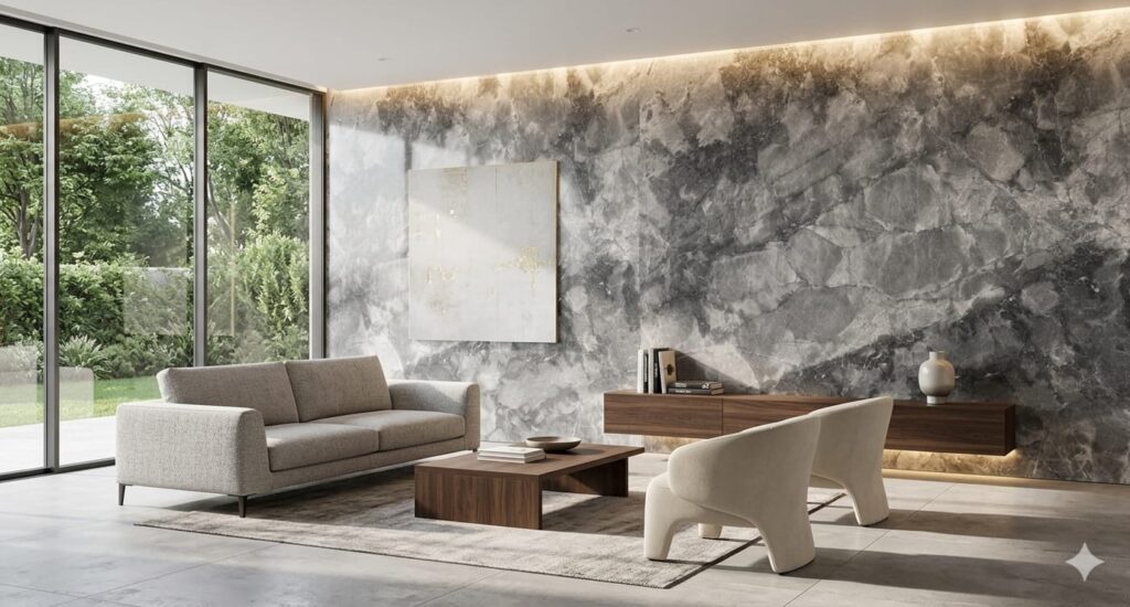 Grey Carnico marble features deep grey tones with contrasting white veins, offering a striking and elegant look for interiors. Enhanced with SAP (Stone Augmentation Process) for improved strength and shine. Available Thickness: 18mm, 20mm