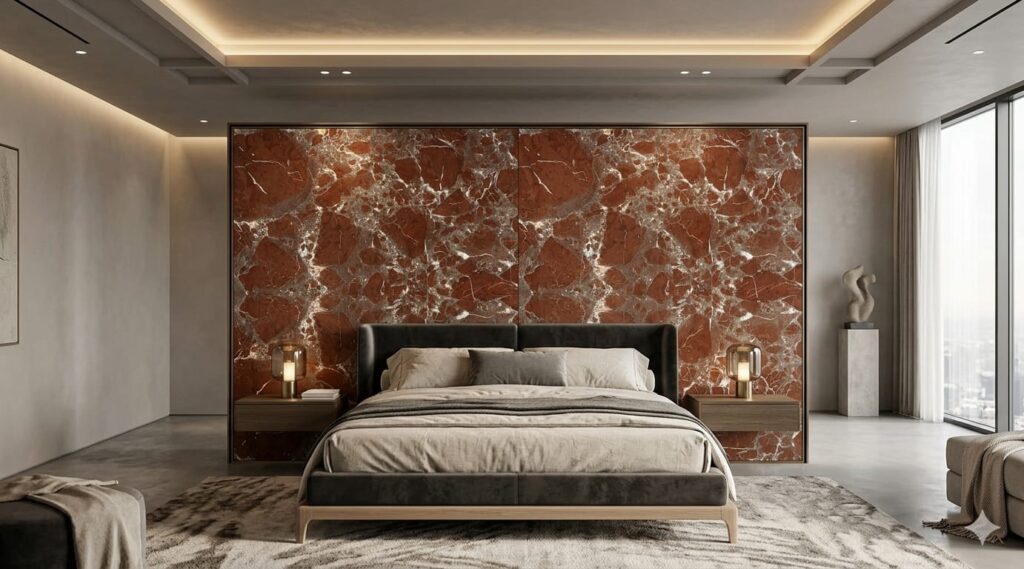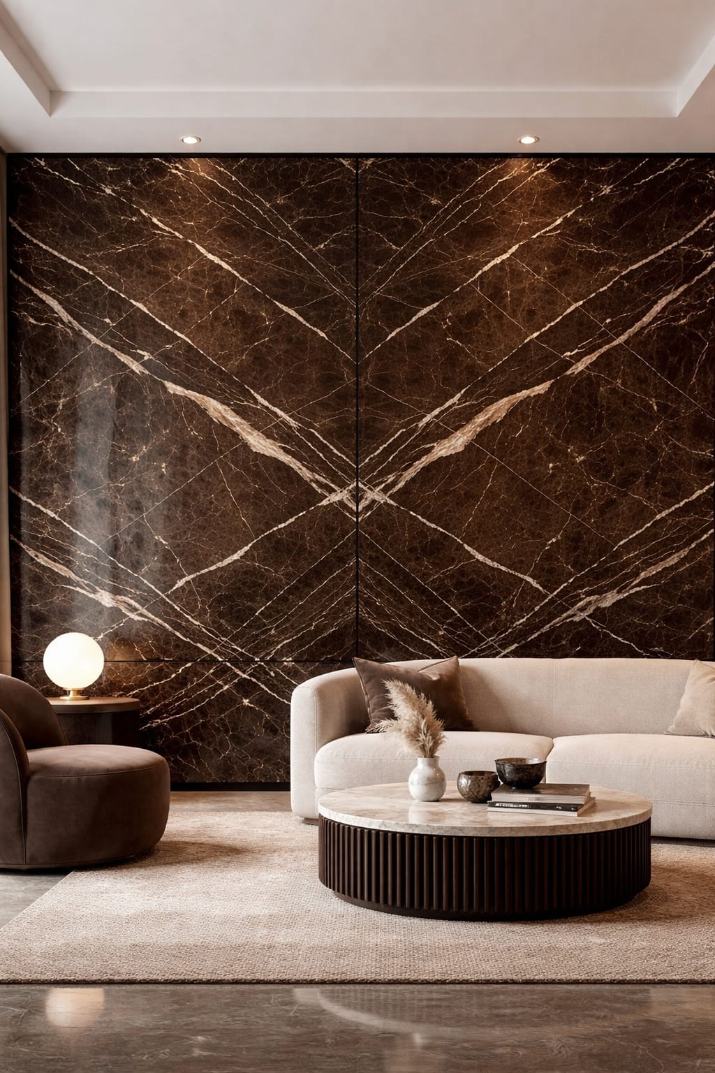 Prestige Brown marble features rich brown tones with elegant natural patterns, adding warmth and sophistication to luxury interiors. Enhanced with SAP (Stone Augmentation Process) for enhanced durability and shine. Available Thickness: 18mm, 20mm